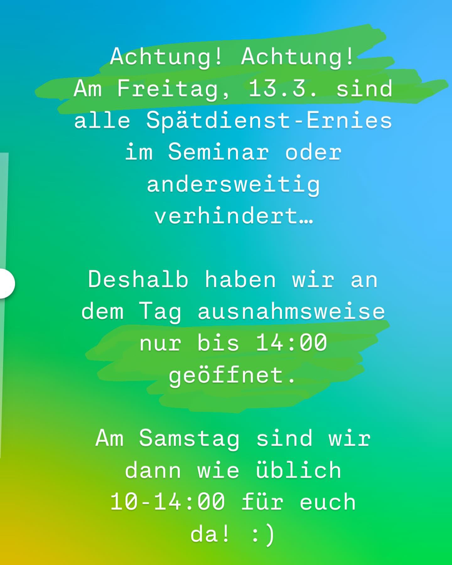#ernas_aktuelles …weil mal alle was anderes vorhaben…diesen Freitag, 13.3. nur 10-14:00 geöffnet. Die Früh- und Mittagstisch-Ernies lassen euch aber sicher noch aufessen ;) Am Samstag haben wir aber wieder regulär geöffnet!